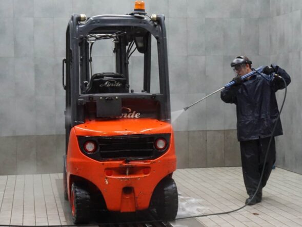 2. Cleaning: Every forklift undergoes high-pressure cleaning before inspection in order to remove any remaining dirt as well as oil and grease. The truck is then ready for a detailed inspection.