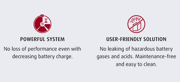 Due to the elimination of emissions and possible impurities in lead-acid batteries, the technology is also particularly suitable for use in areas where a high degree of sensitivity is required, for instance the pharmaceutical or food industry.