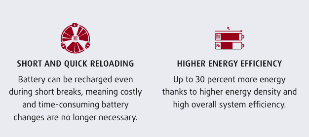 A Li-ION batteries increase the efficiency of the fleet in operation. This results from the technological advantages of this energy system, which offers numerous time and cost advantages in day-to-day logistics and for the associated infrastructure.