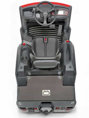 Easy access and exit is ensured with ergonomic, non-slip steps and wide access openings on either side with smoothly curved profiles. The spacious angled foot well and generous legroom, adjustable seat, intuitive automotive control levers, adjustable steering wheel and ergonomic pedal layout provide an optimum working environment for every individual operator. Resilient mountings and swinging arm suspension on all three wheels.