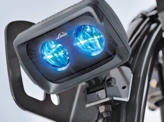 The LED light of the Linde BlueSpot™, attached to the driver’s protective roof frame, project a blue warning spot onto the ground. This warns pedestrians and other forklift drivers of approaching trucks. This visual solution from Linde Material Handling intuitively draws attention to moving forklift trucks. It therefore significantly increases safety, both in aisles and at crossings where visibility is poor.